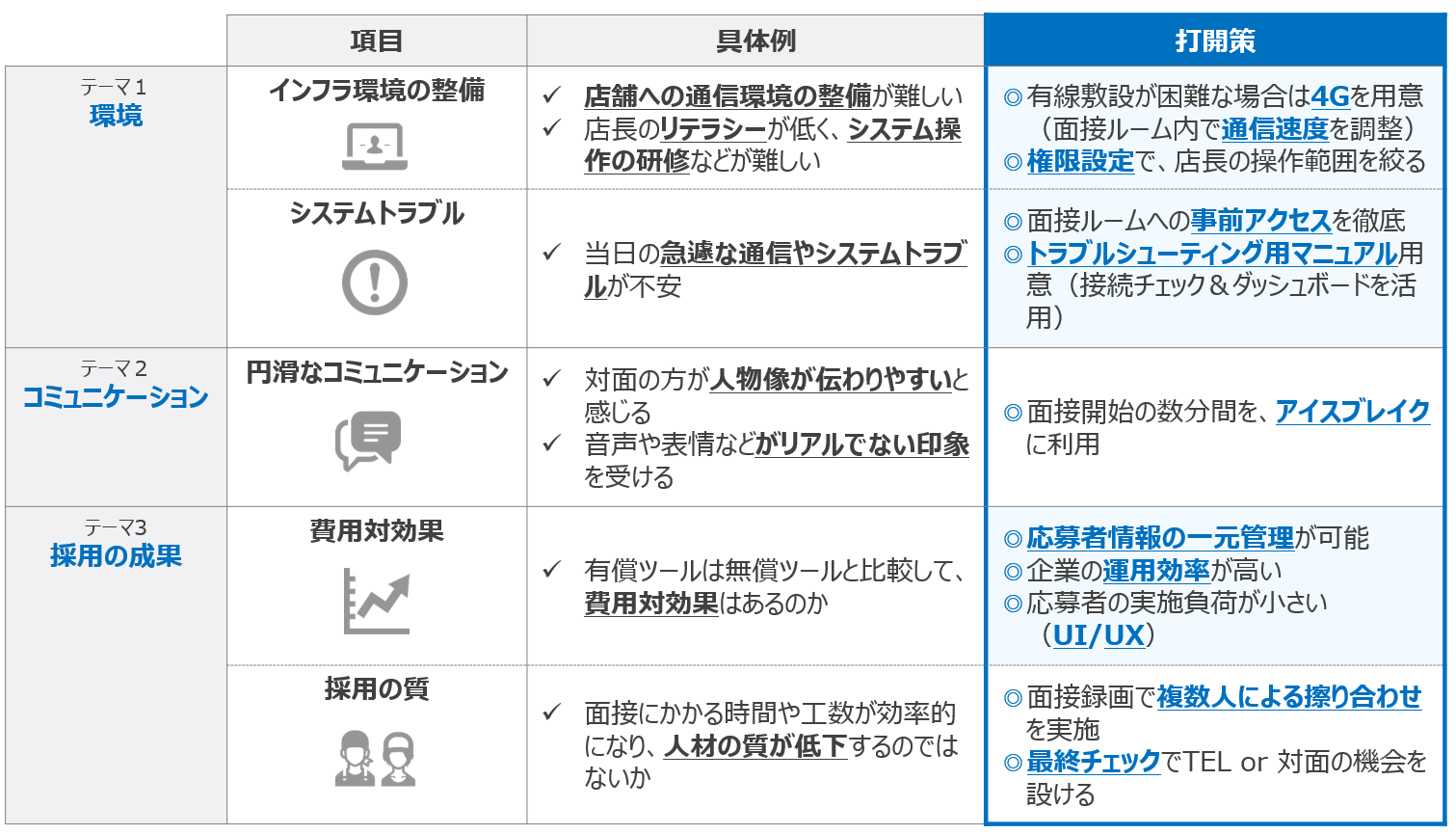 弊社顧客から伺うことが多い、オンライン面接を実施する上での主な障壁の打開策について川邊様にご説明していただきました。