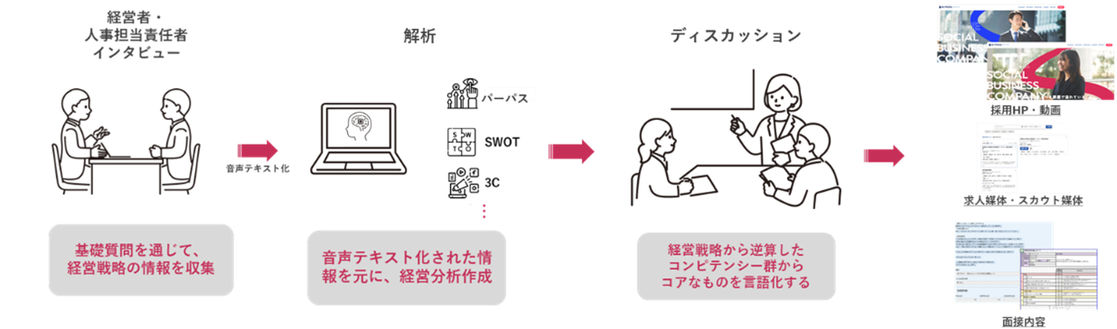 本サービスは、経営層や部門責任者へのインタビューから得た情報をAIが客観的に分析し、企業文化や活躍している社員の共通点を可視化します。これにより、求める人物像の明確化が可能となり、採用媒体の選定や面接設計の最適化を図ることで、採用活動の全般にわたってより戦略的な意思決定を後押しします。